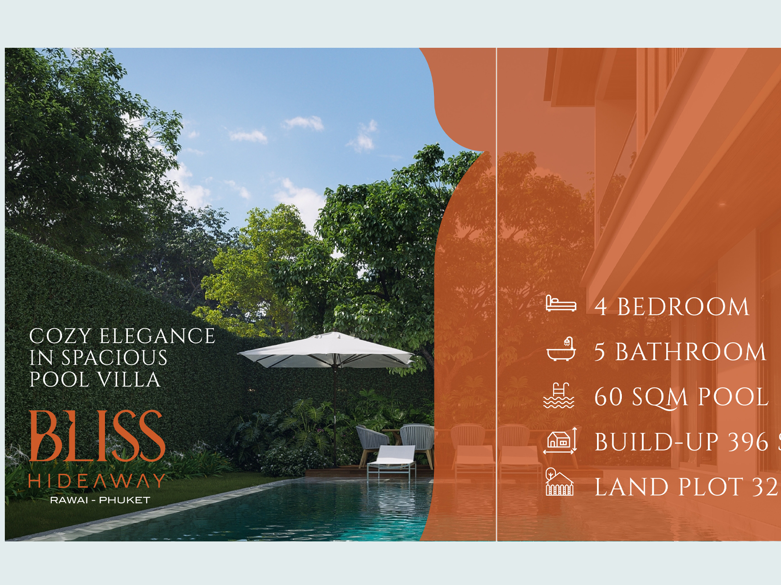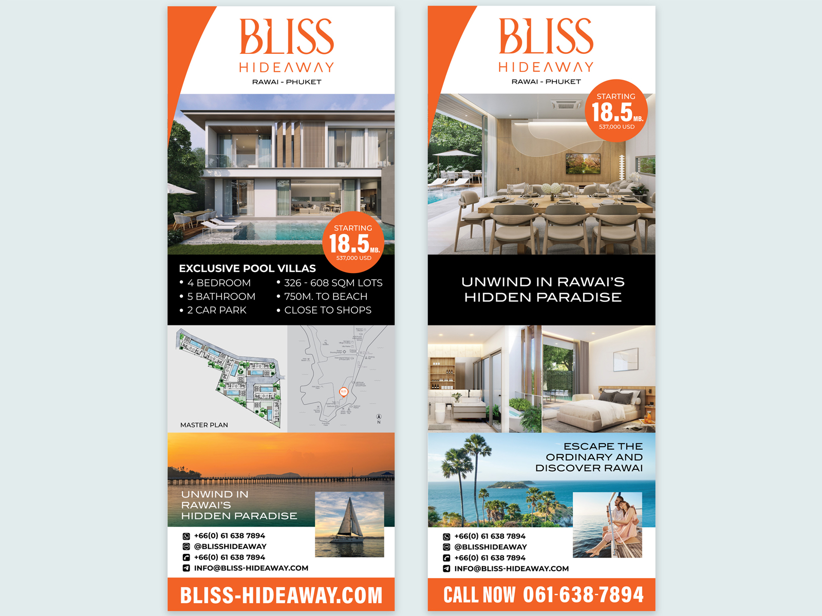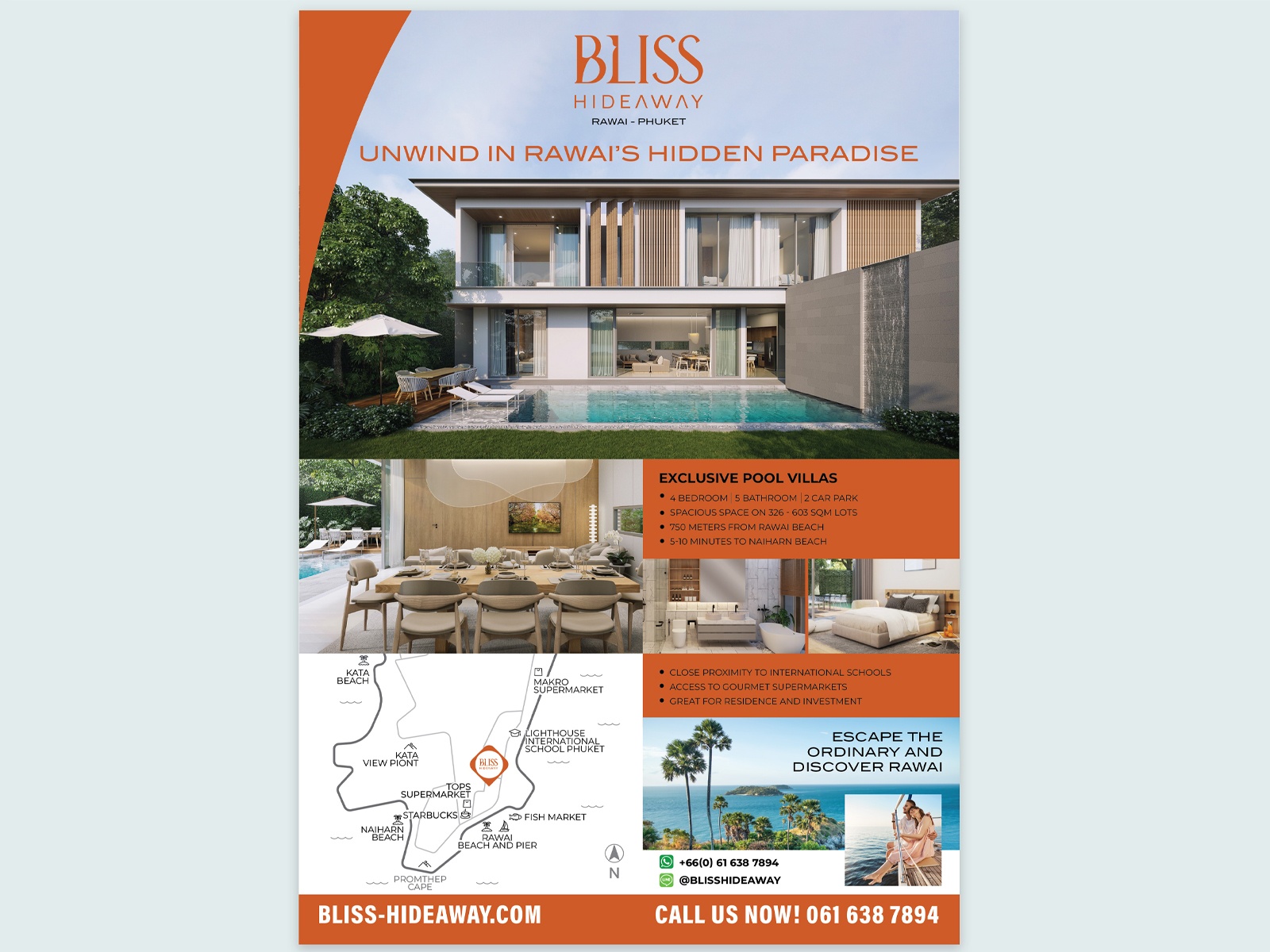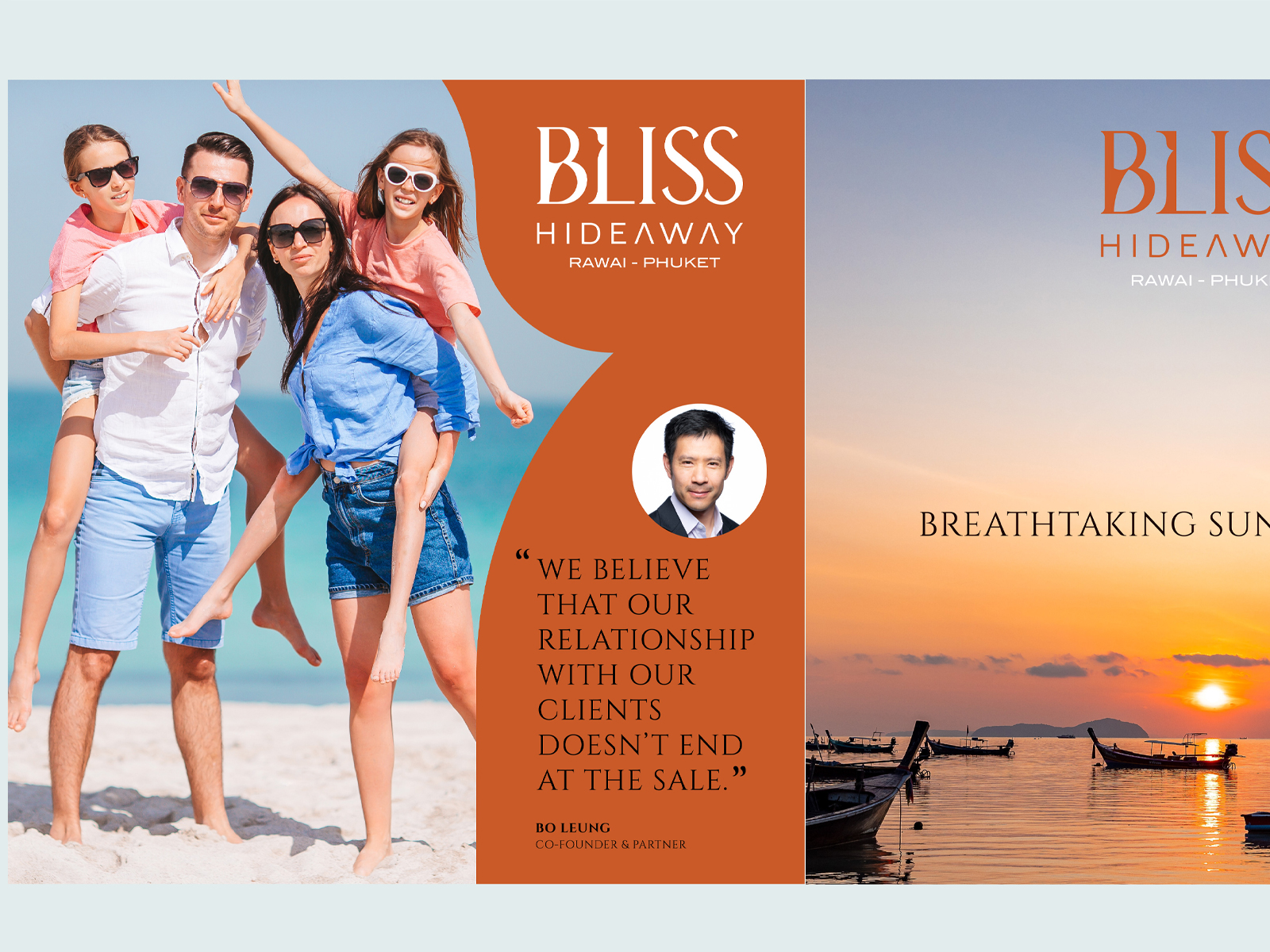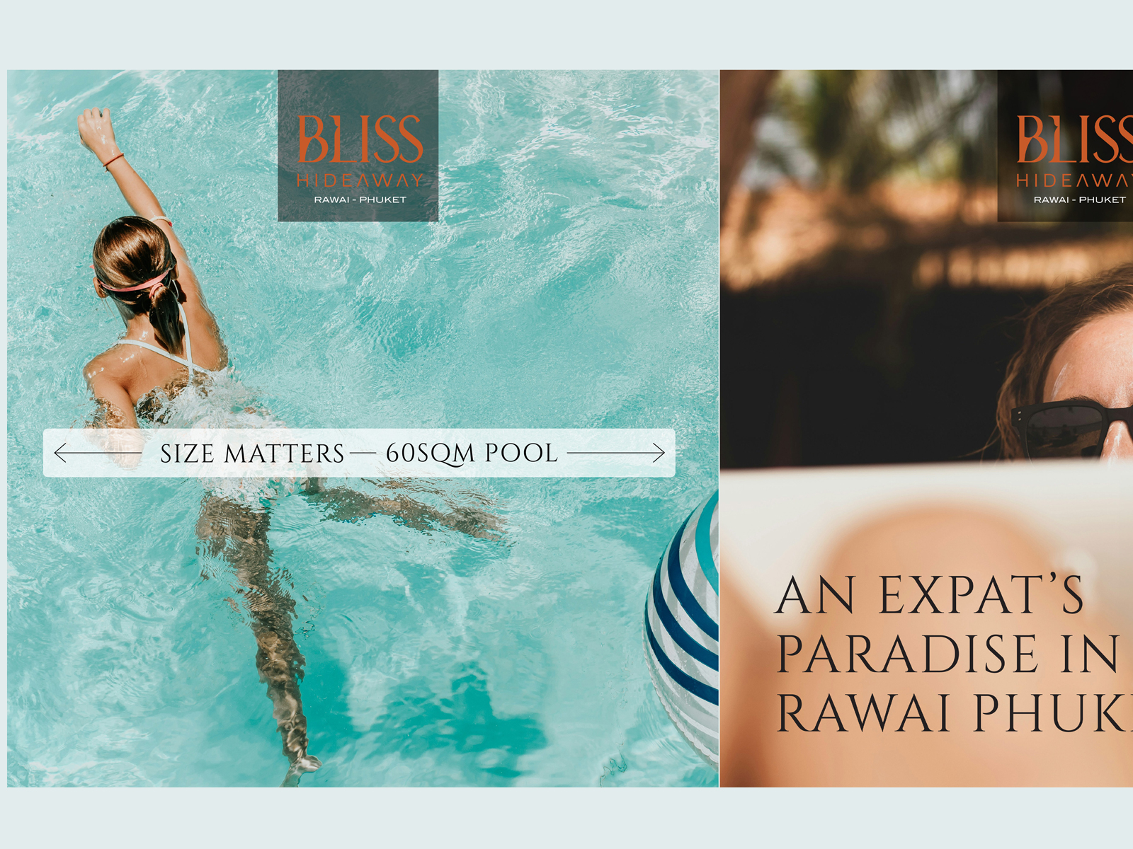 I led the design work, communication strategy, and social media for Bliss Hideaway, a luxury boutique villa project in Rawai, Phuket. I crafted visual branding and creative design elements that reflect the unique aesthetic of the development, developed and managed communication strategies to strengthen the brand’s voice, and handled all social media content planning, creation, and engagement to grow audience awareness and online presence.