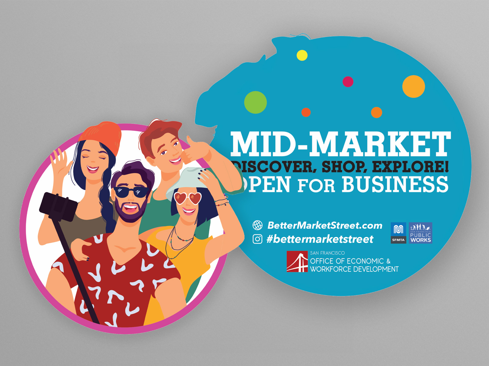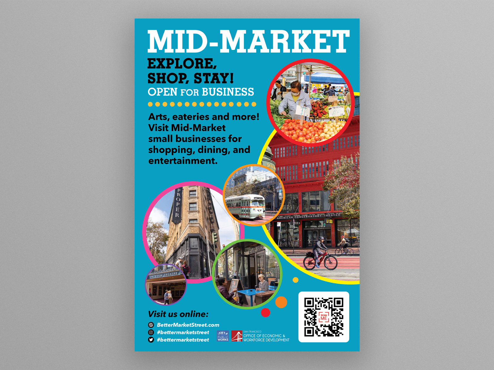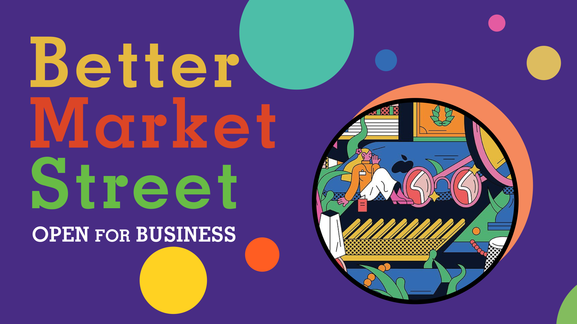 The revitalization of Market Street in San Francisco will unite neighborhoods and connect iconic destinations, such as the Civic Center, cultural venues, and the Salesforce Transit Center. With a focus on bold, colorful, and fun design, the vision is to transform Market Street into a dynamic, inviting public space. It's a place for people to relax in cafés, meet friends, people-watch, or simply enjoy a stroll while engaging with the lively urban scene.